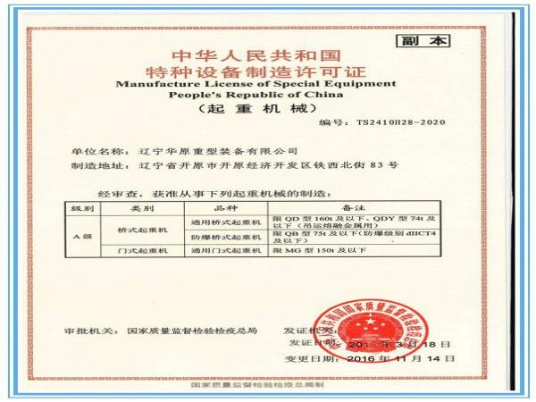 遼寧華原重型裝備有限公司成立于 2011 年 4 月,注冊(cè)資金 2.7 億元。作為遼寧省起重機(jī)械制造產(chǎn)業(yè)基地的龍頭企業(yè),是一家以橋式、門式起重機(jī)、散料 輸送設(shè)備、智能立體車庫(kù)等產(chǎn)品的設(shè)計(jì)、制造與銷售為主的大型裝備制造企業(yè)。